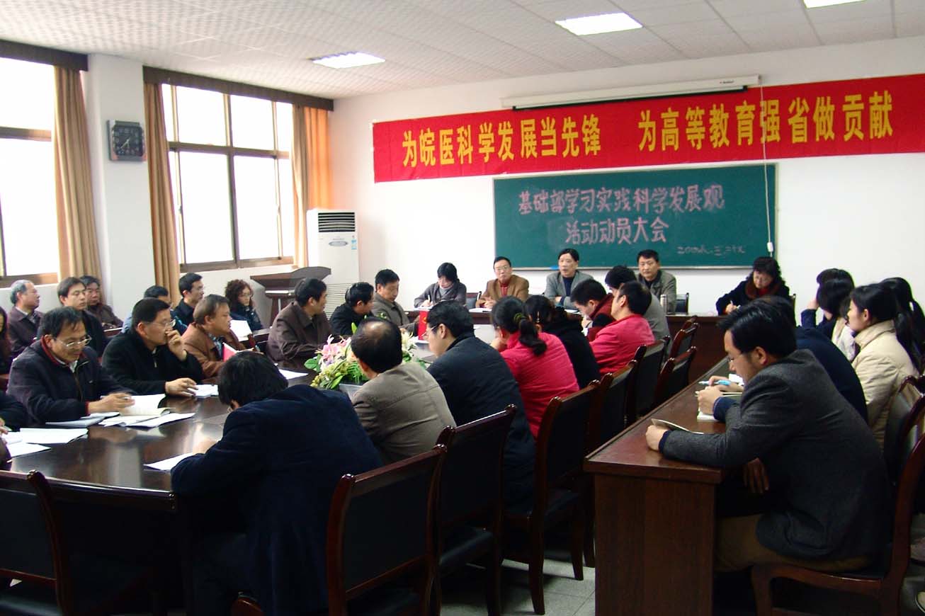 会上,基础部党总支书记、基础部学习实践活动领导小组组长张根葆主任做了动员报告。张根葆主任首先传达了学校关于深入学习实践科学发展观活动的动员大会和相关文件精神,指出开展深入学习实践科学发展观活动,是破解学校发展难题、推动各项事业又好又快发展的迫切需要。我们要按照“党员干部受教育、科学发展上水平、人民群众得实惠”的总要求,认真学习实践科学发展观,准确把握科学发展观的科学内涵,做好调查研究,着力查找和解决基础部教学、科研及人才培养等工作中存在的一些瓶颈问题,切实完成由“观” 到“行”的转化,努力开创学校及基础部发展的新局面。基础部学习实践活动领导小组副组长叶良欢同志和黄勤安同志分别宣布了“关于成立基础部深入学习实践科学发展观活动领导小组的通知”和基础部党总支“深入学习实践科学发展观活动”第一阶段工作方案。 宋建国院长作重要讲话 最后,校党委副书记、院长宋建国同志做重要讲话。他首先强调了开展学习实践科学发展观的重要意义,要求全体党员要深刻领会把握科学发展观的内涵、核心、精神实质、基本要义和根本要求,坚持解放思想,与时俱进,促进发展。宋建国院长指出,此次学习实践活动与以往不同,可以凝练地用6个关键字概括:深入、学习、实践。深入学习不在于形式,更重要在于实践,要联系实际。通过学习,干部党员受教育、科学发展上水平、师生学校得实惠。要充分认识科学发展上水平是高水平的发展,不是低水平的重复。科学发展观的内涵,第一要义就是发展,其核心是要以人为本,基本要求在于全面整体推进,持续发展,并结合学校的实际,做到统筹兼顾。并引用卞国忠书记在报告中提出的:用科学发展观的思路去总结过去、看待今天、谋划未来。谈到具体的学习方法,他要求大家坚持解放思想、突出实践特色、贯彻群众路线、正面教育为主。最后,宋建国院长结合自己在皖医几十年工作的体会,谈到了影响皖医发展的一些瓶颈问题,并提出了今后发展的思路。