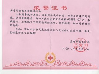 在全世界华人积极向四川同胞奉献爱心的时候,我校同学表现出高尚的情操和奉献精神,积极奉献自己的爱心。我校青年志愿者协会,爱心社,红十字会积极组织志愿者参加芜湖市红十字会的募捐活动。我校团委还积极与芜湖市中心血站联系,在需要的时候将组织志愿者无偿献血。我校国旗班在十九日升旗仪式后降半旗向地震遇难者默哀。