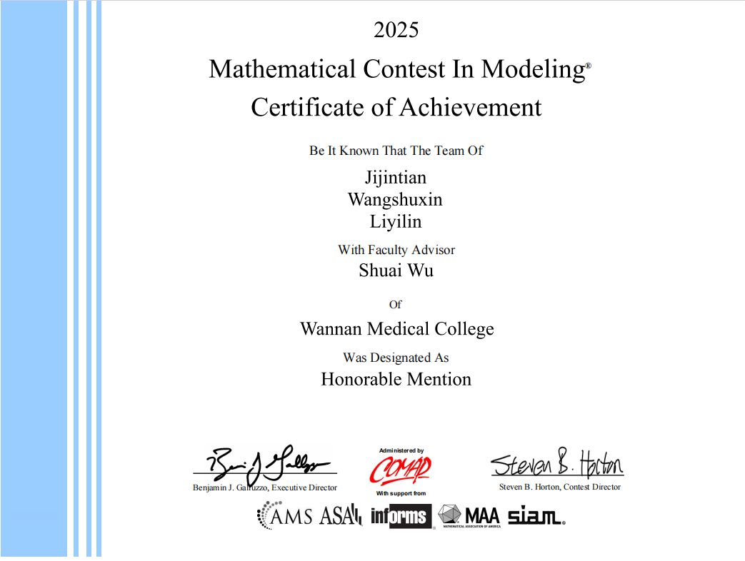 近日,2025年美国大学生数学建模竞赛成绩揭晓,由我校医学信息学院副院长昌杰教授指导,季锦添、汪舒欣和李伊琳三名本科生组成的参赛队伍提交的“Medals in the Olympics: Exploring Host Country Advantages, Great Coaches and Emerging Nations with Attention - LSTM and Random Forest”论文从众多参赛作品中脱颖而出,斩获二等奖(Honorable Mention,H奖),实现了我校在国际化数学建模赛事上的精彩亮相。