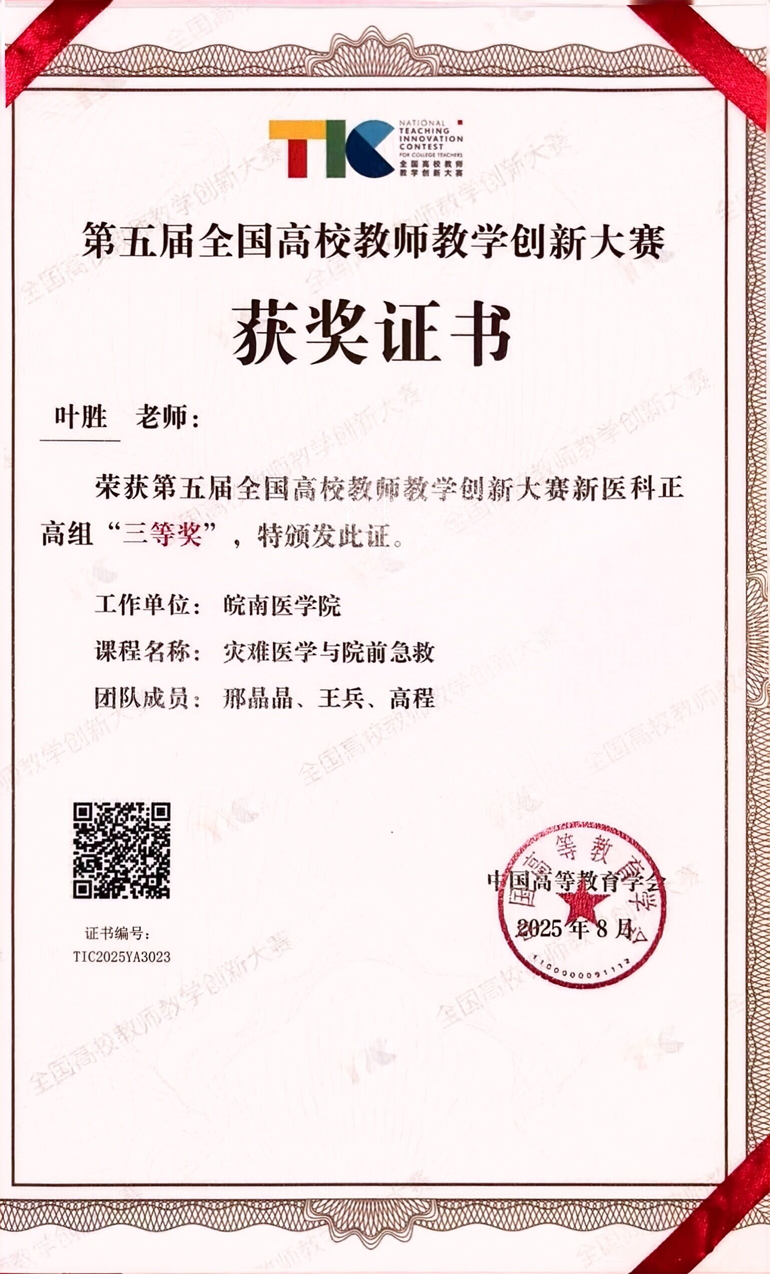 8月19日,由教育部高等教育司指导、中国高等教育学会主办的第五届全国高校教师教学创新大赛全国赛在北京圆满落幕,副院长余结根带队参赛。我校二附院叶胜老师团队凭借《灾难医学与院前急救》课程的教学创新成果,荣获新医科正高组三等奖,实现我校在该项国家级赛事中零的突破。