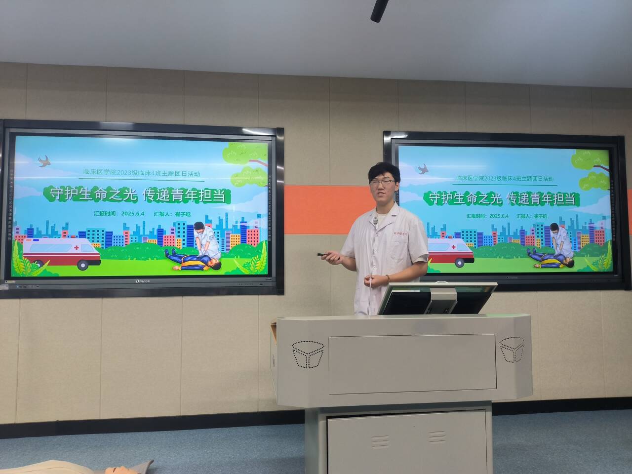 为强化青年学子的使命感,提升医学生的应急救护与临床实践能力,6月4日下午,临床医学院“一站式”学生社区团支部在4号实验楼6楼智慧教室举办“守护生命之光 传递青年担当”主题团日活动。活动采用情景模拟、主题演讲、互动问答等形式,将理想信念教育与专业实践深度融合。校团委副书记黄龙、秘书左小炫,各二级学院班级团支部书记代表到场观摩交流。
