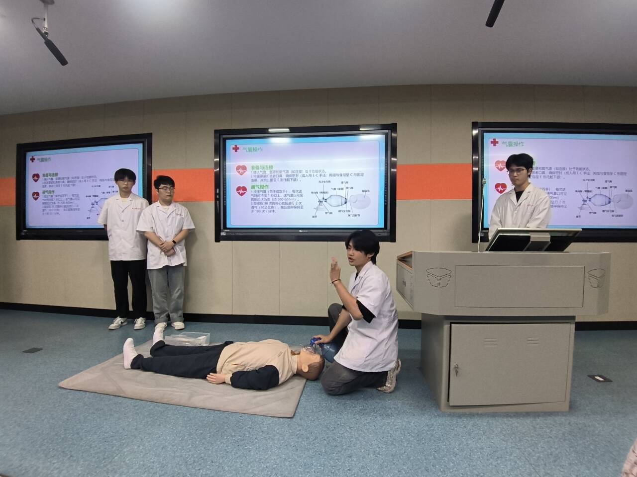 在实践操作与情景模拟环节,同学们积极参与其中。模拟急救场景中,大家熟练运用所学知识与临床技能,进行心肺复苏、AED仪和气囊的操作展示。临床技能协会志愿者详细解释了每一步细节所蕴含的生命哲理和人文知识,并带领同学们深度思考和讨论,将理论知识转化为实际行动,进一步提升了危机处理能力与团队协作意识。