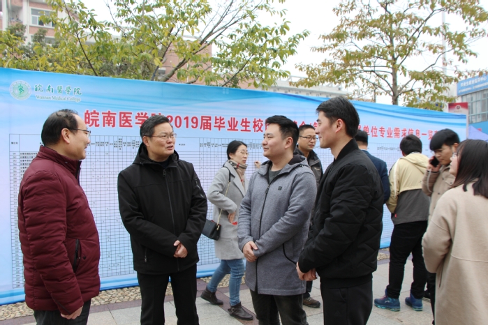 3月7日,我校2019届毕业生首场春季校园招聘会在大学生活动中心广场如期召开,204家企事业单位携带5462个岗位走进现场。在学生处处长傅万山陪同下,安徽省教育厅大中专毕业生就业指导中心吴命文、胡博文来到学校校园招聘会现场,指导工作并与招聘单位深入交流。