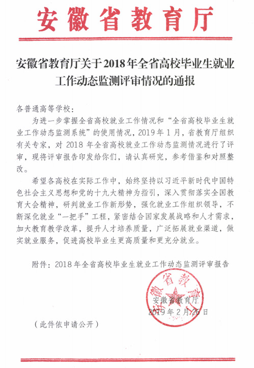 近年来,我校毕业生综合素质社会反应良好,来校招聘单位及提供岗位数量逐年增多。近日,安徽省教育厅下发了《安徽省教育厅关于2018年全省高校毕业生就业工作动态监测评审情况的通报》文件,其中,我校在“落实'一把手'工程,就业工作保障有力”环节被点名表扬。“就业工作机制完善,组织保障有力,就业工作成效显著”是安徽省教育厅对我校就业工作的评价。学生处就业指导中心将继续做好2019届毕业生的就业服务工作,通过举办综合性招聘会与专场招聘会相结合的方式,加强就业工作的“供给侧结构性改革”,做到精准推荐、精准帮扶,提高就业工作满意度,推动毕业生就业质量的全面提升。