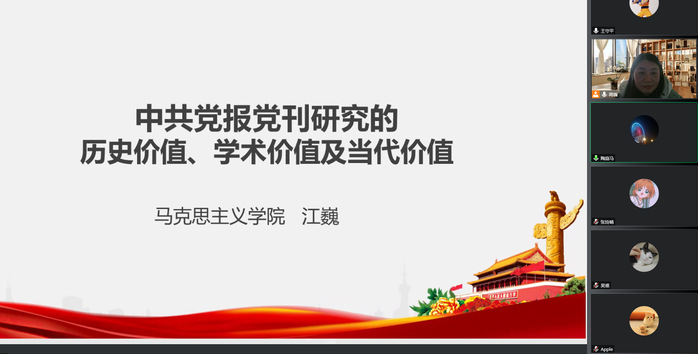 马克思主义学院江巍博士以“中共党报党刊研究的历史价值、学术价值及当代价值”为题,通过线上方式作学术讲座。她以中共党报党刊发展的百年历程为切入点,系统梳理了建党至土地革命时期、抗日战争至解放战争时期、新中国成立至新时代党报党刊的发展演进情况,总结了当前党报党刊的研究现状及存在问题。江巍博士表示,党报党刊是党的喉舌,与党的成长壮大关系密切,一方面有其历史价值,是一笔宝贵的历史财富,是我们了解和学习中共党史的生动素材;另一方面有其学术价值,有利于充实中国近代报刊史、新闻史和文化史的研究,深化中共党史、新中国史、改革开放史和社会主义发展史的研究并提供丰富材料,进一步丰富马克思主义理论、中共党史党建等一级学科研究的视角和领域。整场讲座思路清晰、内容丰富、深入浅出,与会教师一致表示受益匪浅。