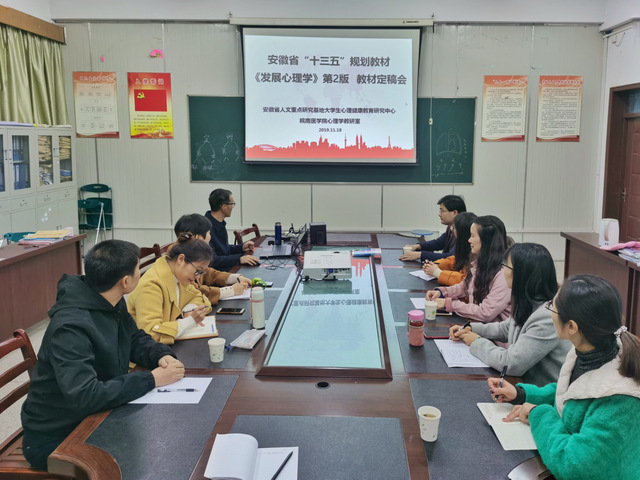 2019年11月18日晚上,人文社科重点研究基地大学生心理健康教育研究中心在心理学教研室召开了《发展心理学》第二版教材编写定稿会议,学校、一附院、芜湖第二人民医院等单位的编委参加了会议。会议由人文基地常务副主任张婷主持,此系列教材总主编刘新民教授做总体的部署和点评。