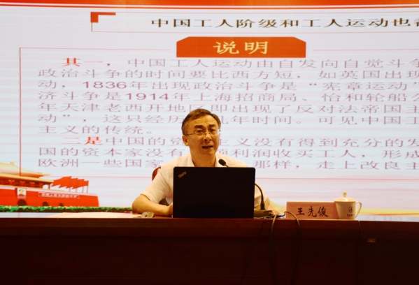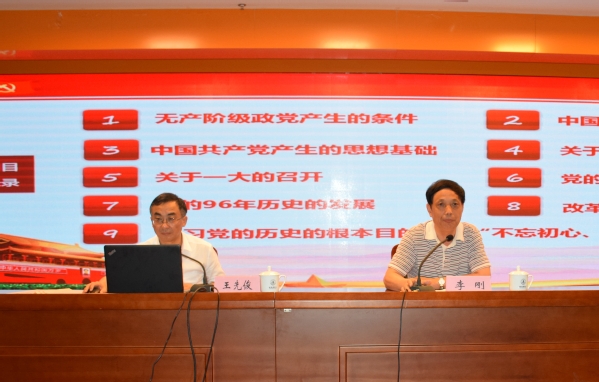 王先俊从学理的角度,阐释了中国共产党产生的阶级基础、思想基础和历史选择马克思主义的必然原因,从历史的角度以大量的史料、经典论著和学术著作为基础重温了中国共产党从筹备到成立的过程。针对在场的青年党员,王先俊指出中国共产党史是一部奋斗史、探索史和自身建设史,历史是最好的教科书,广大青年要学习国史和党史,多读书、读经典、读原著,科学把握党的历史主题和主线、主流和本质,铭记历史、明辨是非,坚定理想信念,时刻牢记中国共产党人的初心和使命,积极发挥党员先锋模范作用,为实现“皖医梦”,进而为实现中华民族伟大复兴的中国梦贡献力量。最后王先俊引用习近平总书记在北京大学座谈会上的讲话对青年提出四点希望:“要爱国,忠于祖国,忠于人民;要励志,立鸿鹄之志,做奋斗者;要求真,求真学问,练真本领;要力行,知行合一,做实干家”。
