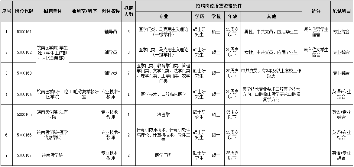 1.统一笔试。主要根据岗位需要,考查应聘人员的专业素质、知识水平和实际运用能力等。教师岗笔试科目为英语和专业综合,时间90分钟/科,满分100分/科;辅导员岗笔试科目为专业综合,时间120分钟,满分100分。英语以本科《大学英语》教学大纲为主,专业综合内容为岗位相关的政策理论和职业能力知识等,主要考查分析和解决问题的能力。